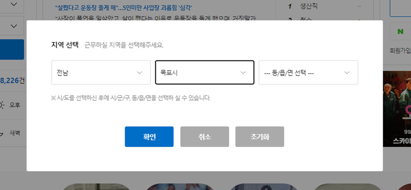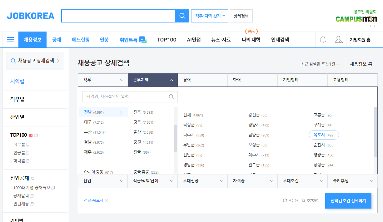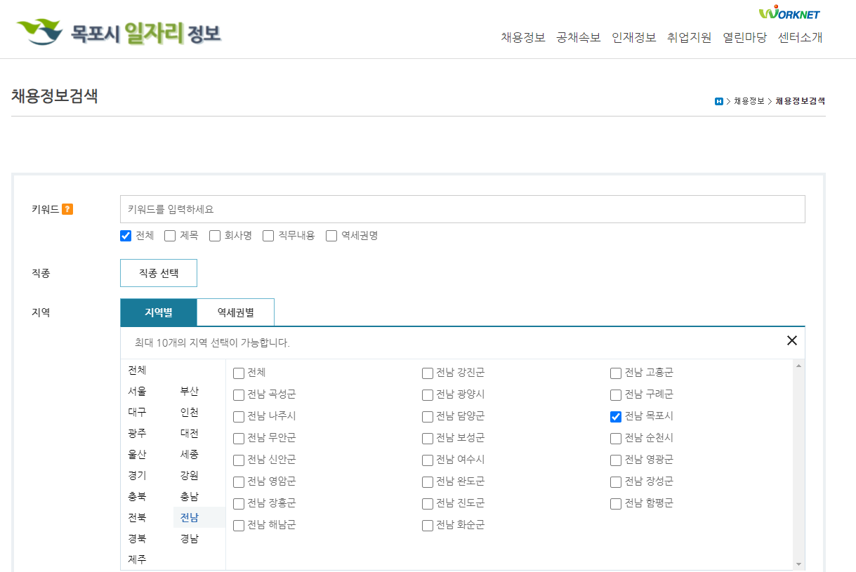 ② 채용정보를 누르시고, 지역별 세부메뉴로 들어가서 전남 > 목포시를 선택하세요.