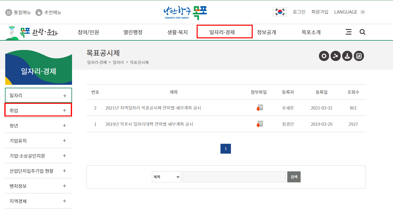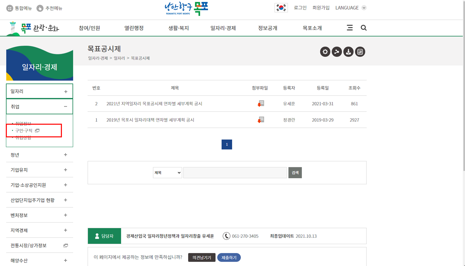 ③ 구인구직을 클릭하면 목포시 일자리 정보 센터 페이지로 이동합니다.