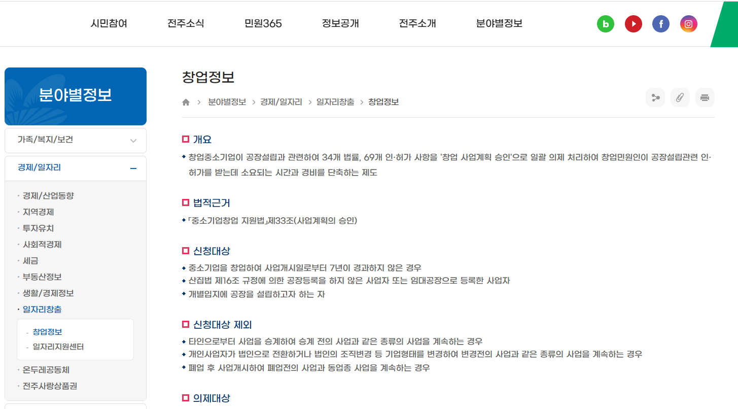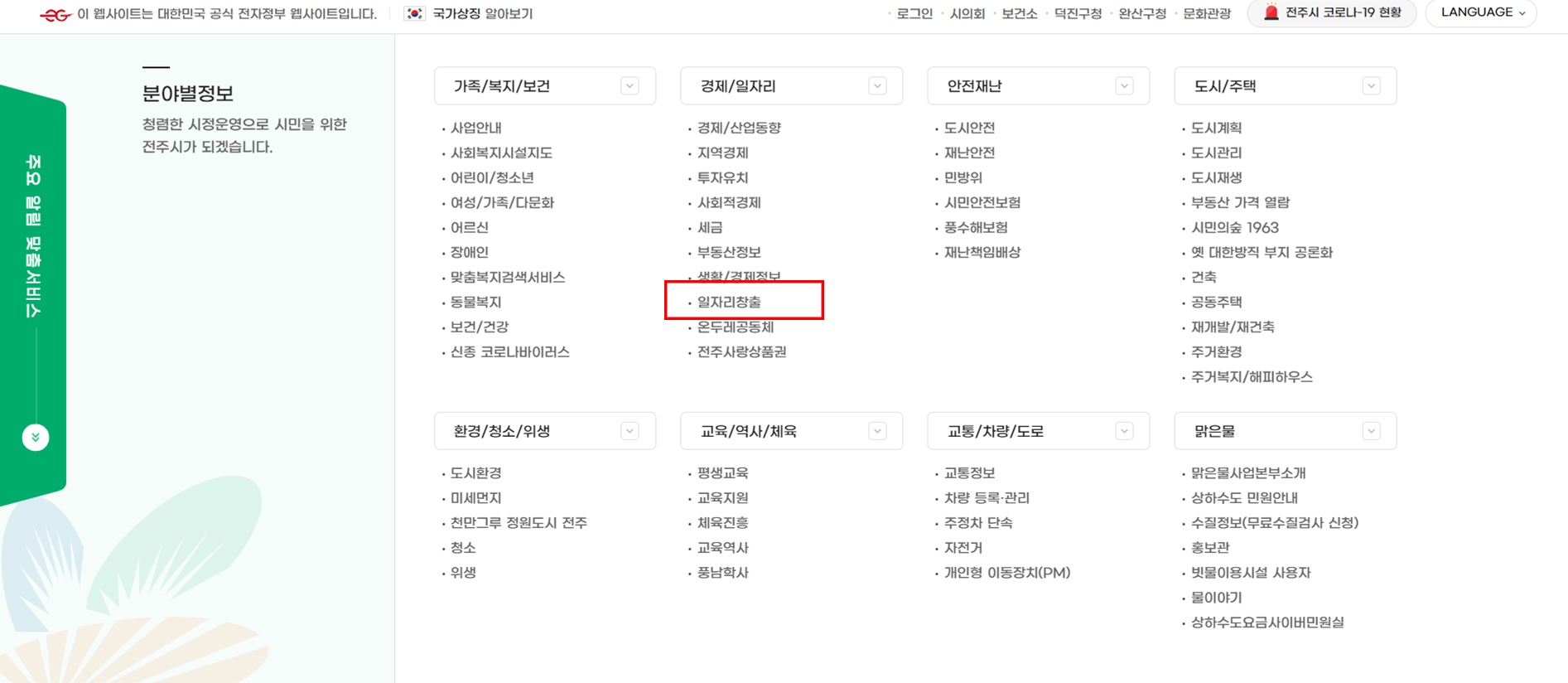 ② 하단메뉴에 분야별 정보를 누르시고, 경제/일자리의 '일자리창출'을 클릭하세요.