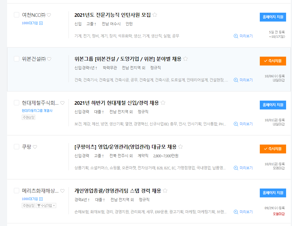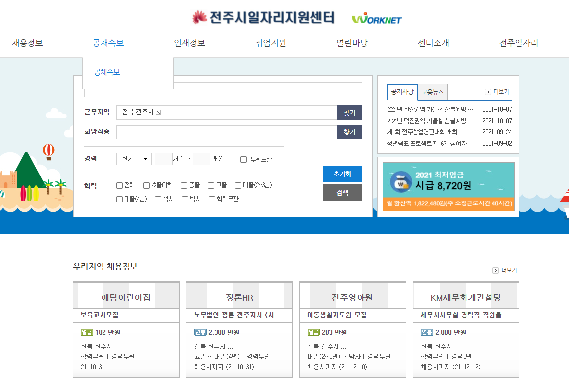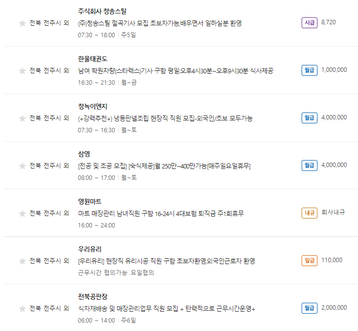 전주시가 두곳으로 구분되어 채용정보를 검색 할 수 있습니다.