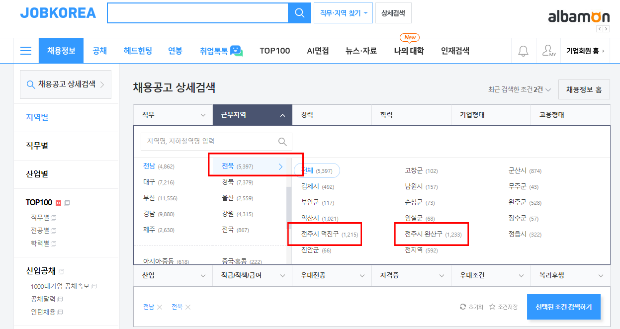 ② 채용정보를 누르시고, 지역별 세부메뉴로 들어가서 전북 > 전주시 덕진구, 전주시 완산구를 선택하세요.