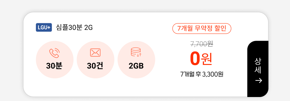 - LGU+ 심플 30분 2G 음성 30분 / 문자 30건 요금제가 월 7,700원에서 6개월간 0원으로 적용합니다.