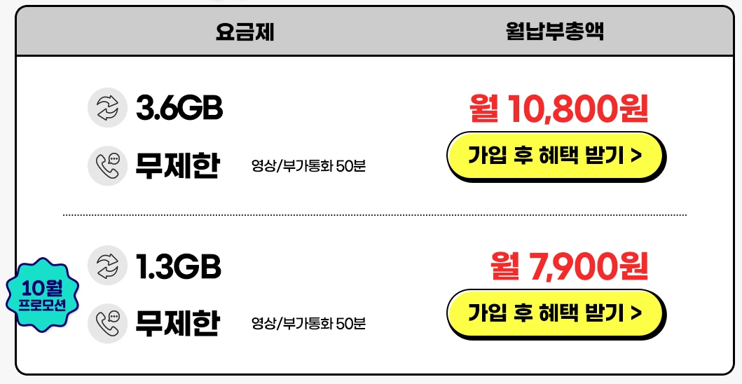 - 1.3GB / 통화무제한 (영상/부가통화는 50분 제공)의 요금이 10월 이벤트 기간동안 7,900원으로 진행됩니다. 한번 가입하면 평생 적용됩니다. 참고하시기 바랍니다.