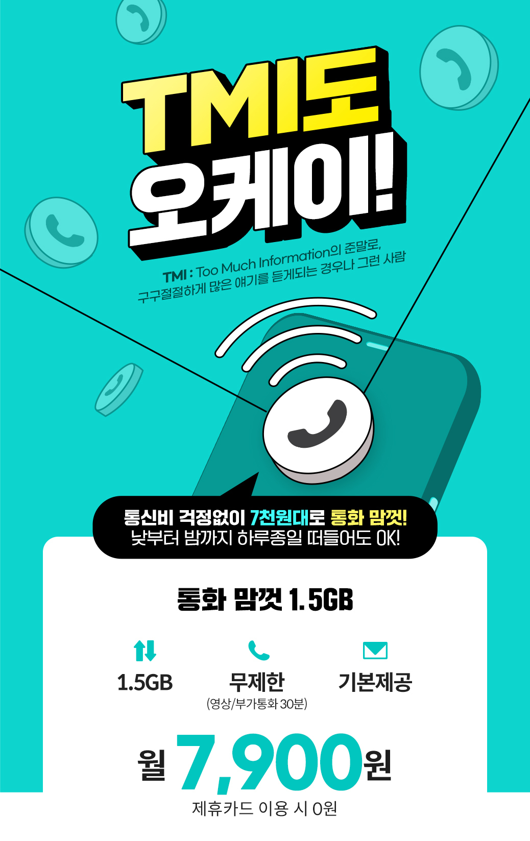 - 통화맘껏 1.5GB에 무제한 통화 / 문자 기본제공의 요금제가 평생 7,900원입니다. 만약, 제휴카드 이용시에는 최대 0원으로 이용할 수 있습니다.