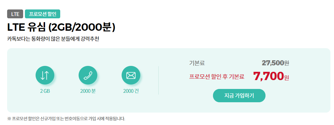 - LTE유심 2GB/2000분 제공하는 요금제가 월 27,500원에서 프로모션 할인 후 기본료가 7,700원으로 할인혜택합니다.