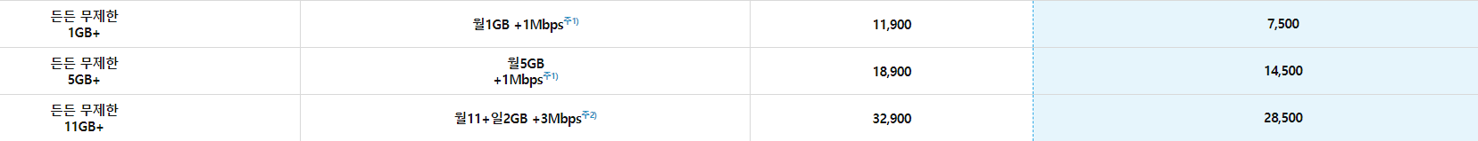 - LTE 든든 무제한 11GB+ 월 기본료 32,900원에서 할인되어 28,500원으로 적용됩니다.
