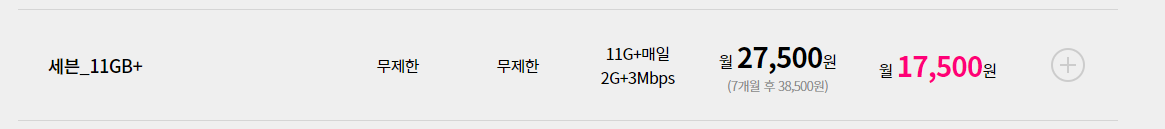 - 세븐_11GB+ 무제한 요금제는 기존의 월 27,500원에서 10월 이벤트 기간동안 17,500원으로 할인 적용됩니다.