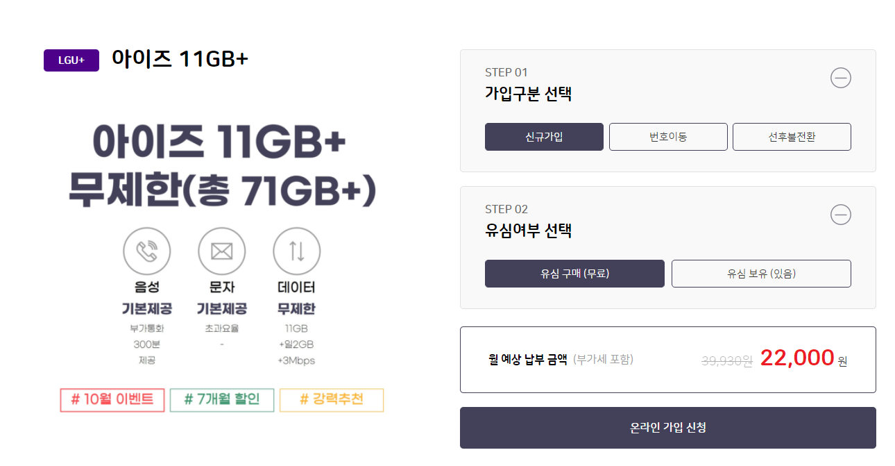 - 아이즈 11GB+ 무제한 (총 71GB+) 음성, 문자, 데이터 무제한 요금제 10월 이벤트 동안 22,000원 적용됩니다.