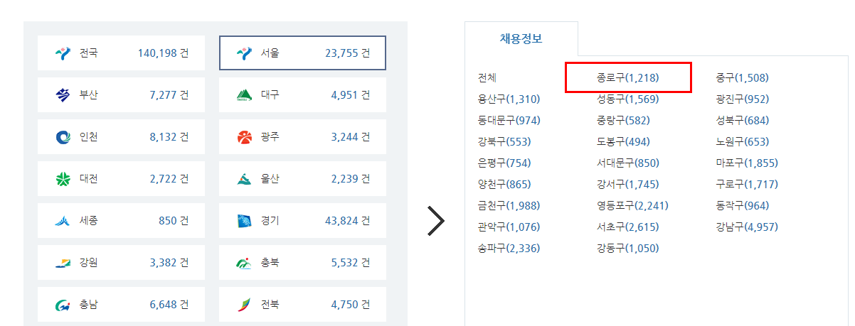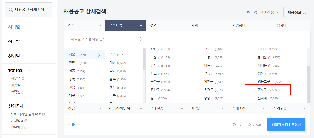 ② 채용정보를 누르시고, 지역별 세부메뉴로 들어가서 서울 > 종로구를 선택하세요.