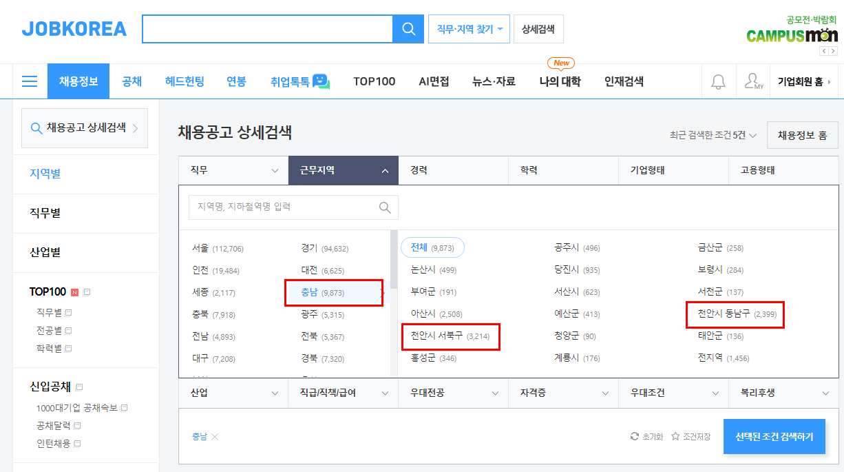 ② 채용정보를 누르시고, 지역별 세부메뉴로 들어가서 충남 > 천안시 서북구, 동남구를 각각 선택하셔서 일자리를 검색하시기 바랍니다.