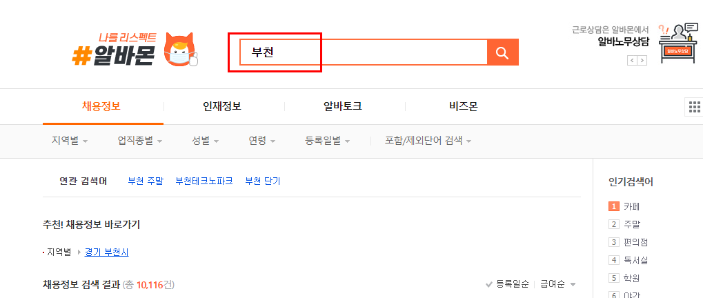 상권이 성업하는 곳의 장소나 이름 또는 지역명으로 바로 검색 후, 직무를 고르셔서 일자리를 찾는 방법이 더욱 편리합니다. 아래와 같이 '부천'으로 입력후 검색하면 약 10000건 이상의 알바자리가 있습니다.