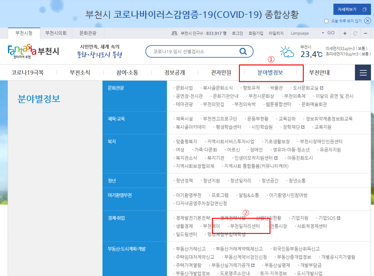 ① 분야별 정보를 클릭합니다. ② 경제취업난에 '부천일자리 센터'를 클릭하면 부천일자리센터 홈페이지로 이동합니다.