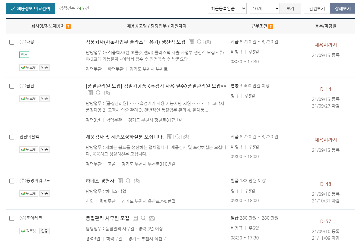 사출, 제품검사 포장, 정밀기계 경력, 품질관리사무원, 부품 조립등의 일자리가 많습니다.