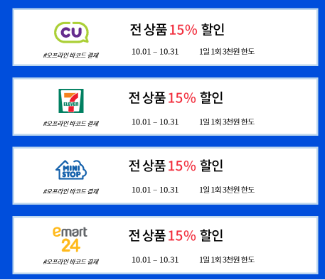 10월에도 알뜰한 편의점 생활 하셔야죠. 다양한 형태의 편의점 할인 혜택, 이벤트 알려드리겠습니다.