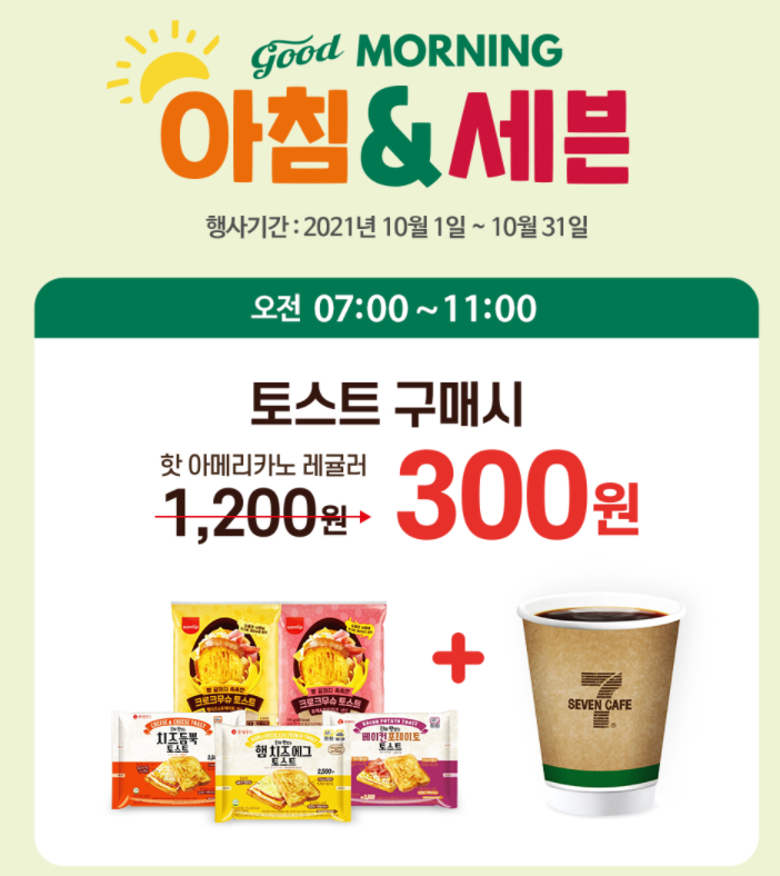 - 아침 & 세븐 오전 7시부터 11시까지 : 토스트 구매시 핫 아메리카노 레귤러 1200원을 300원 가격으로 판매합니다.