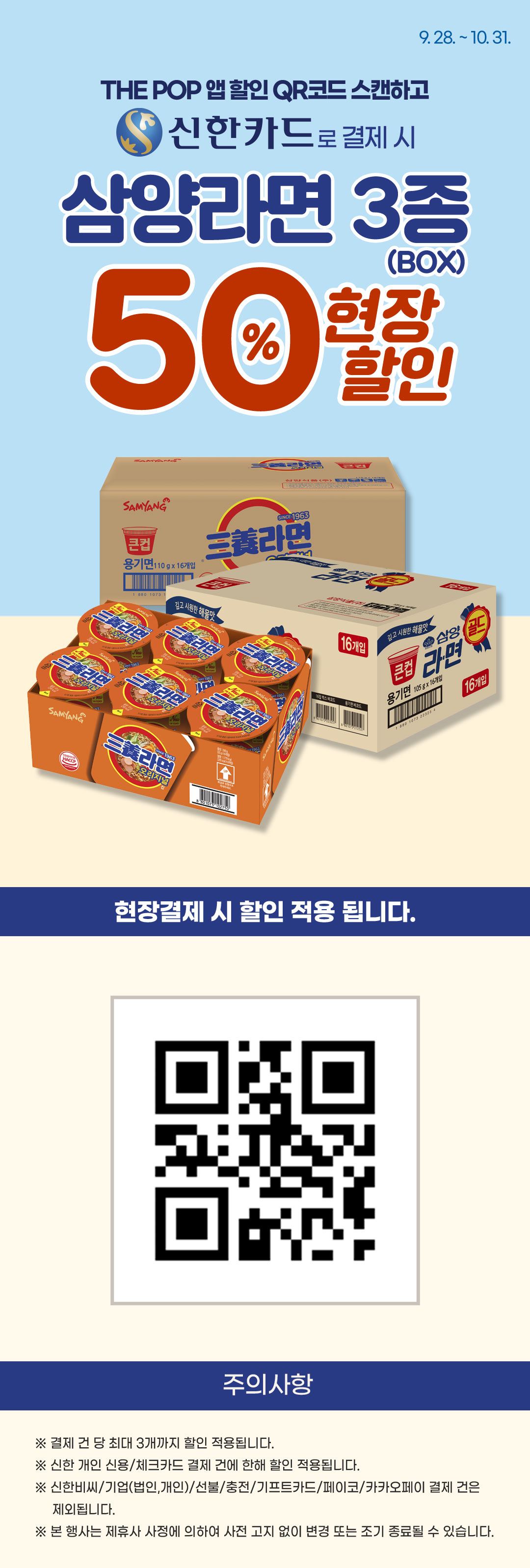 - QR코드 스캔 후, 신한카드 결제 시 삼양라면 3종 박스 50% 할인