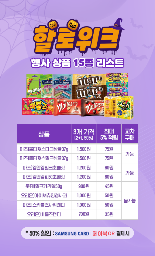 - 할로위크 삼성카드 ㅣ 페이북 결제시 할인 행사 : 2+1, 50% + 3% 추가 적립