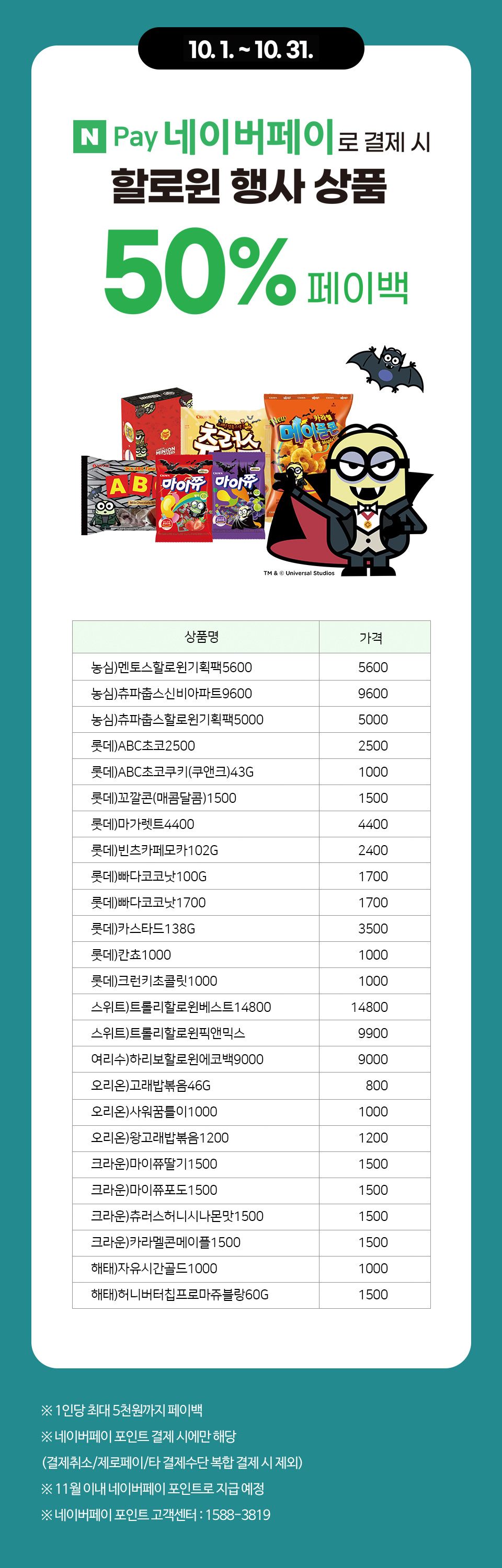 - 할로윈 행사 상품 네이버페이로 결제시 50% 페이백