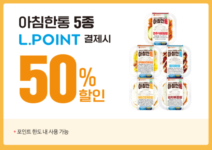 - L POINT로 결제 : 아침한통 5종 50% 할인