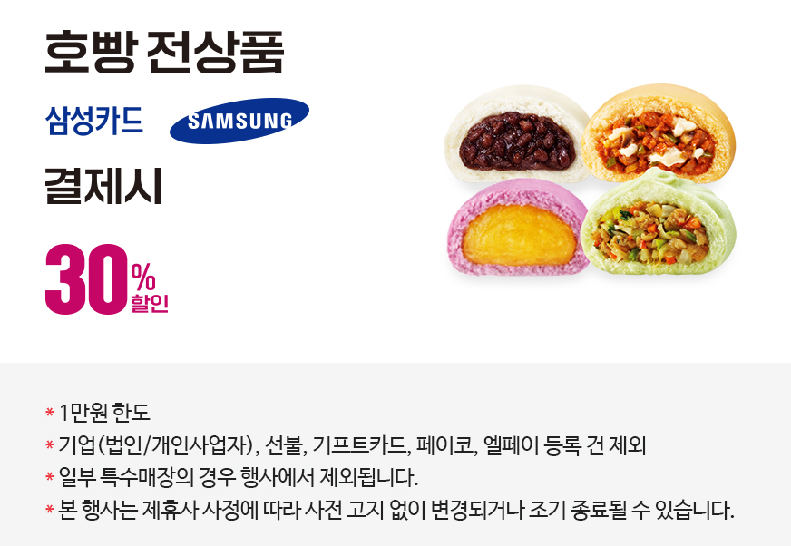 - 삼성카드 호빵 전상품 결제시 30% 할인 : 10월 1일~31일
