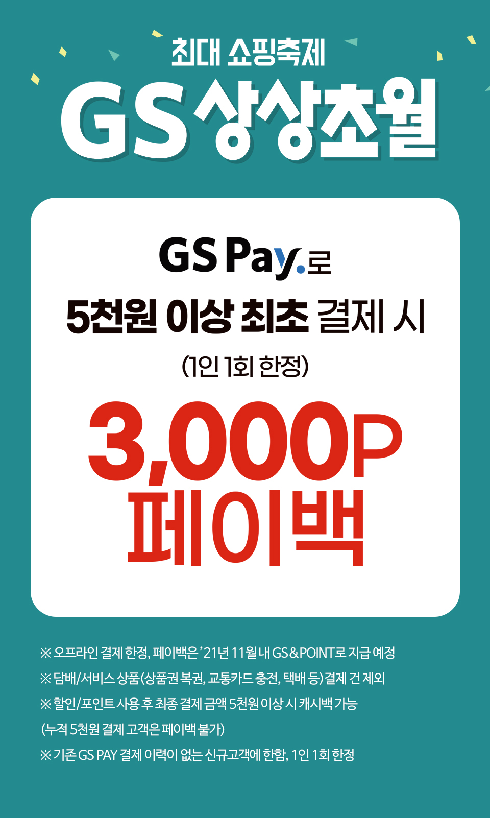 - GS PAY로 5천원 이상 최초 결제시 (1인 1회 한정) : 3,000p 페이백