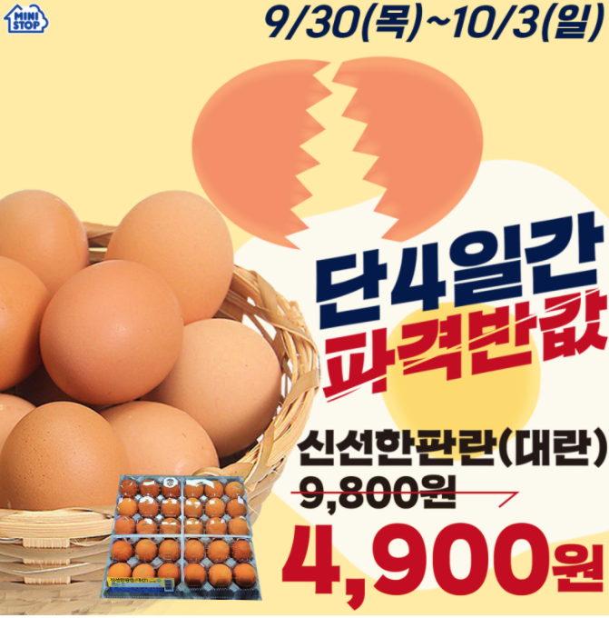 - 9월30일~10월 3일 단 4일간 파격반값 : 신선한대란 계란 9,800원을 4,900원 50% 할인
