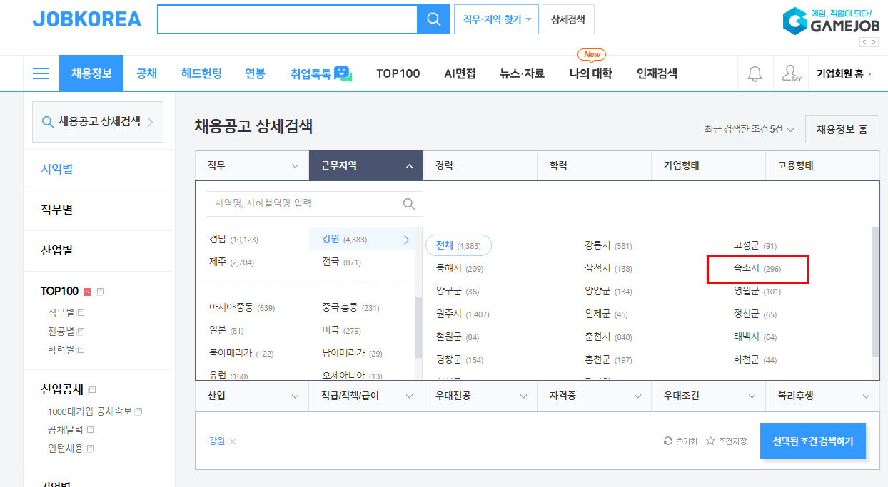 ② 채용정보를 누르시고, 지역별 세부메뉴로 들어가서 강원 > 속초시를 선택하세요.