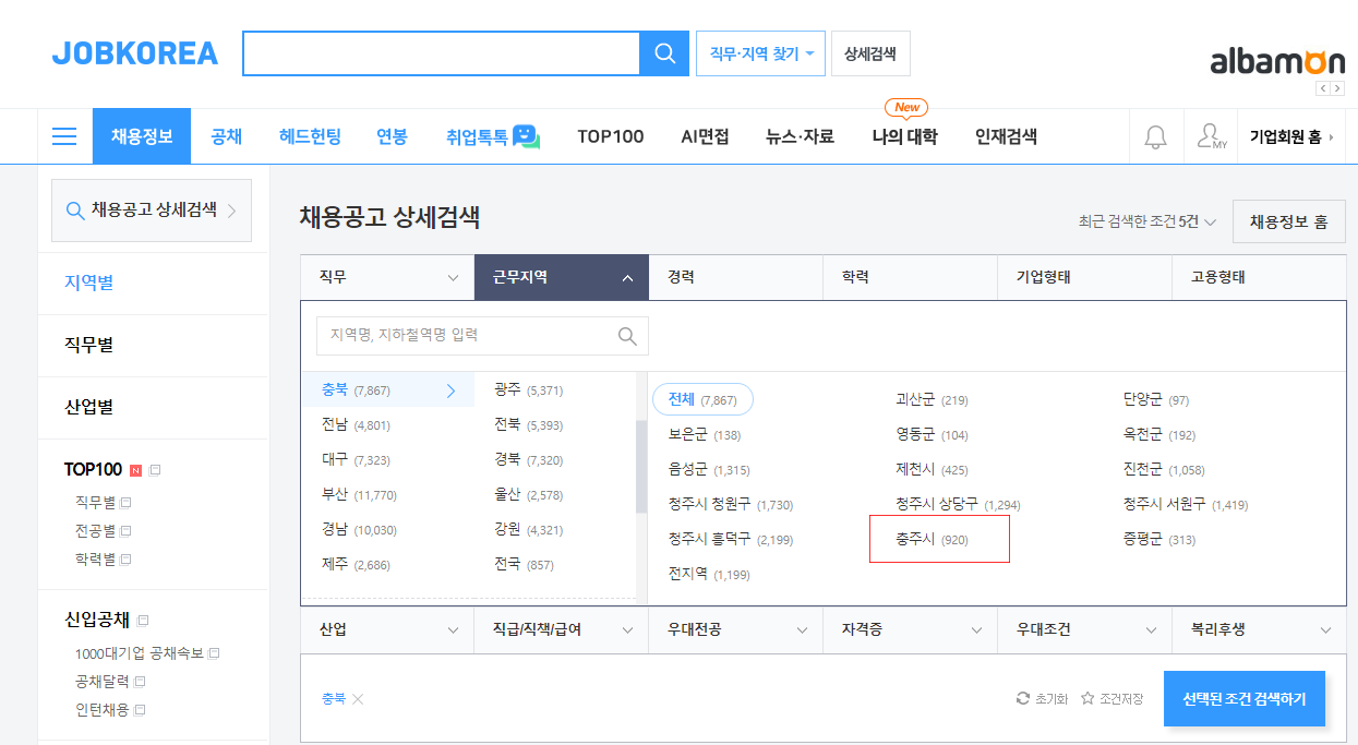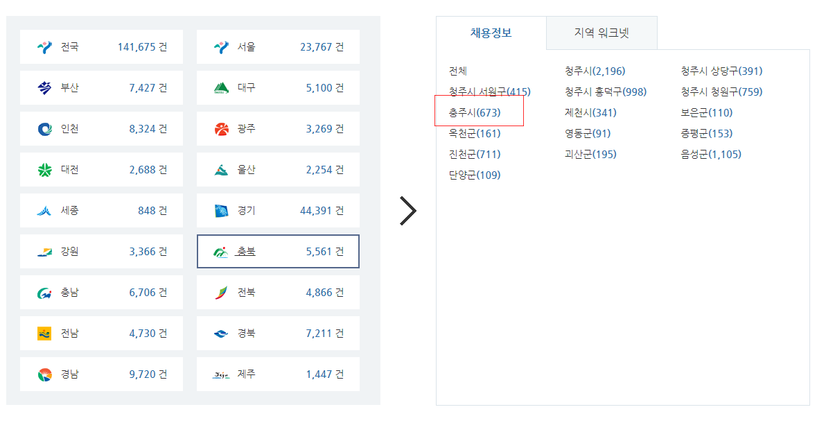 ② 채용정보를 누르시고, 지역별 세부메뉴로 들어가서 충북 > 충주시를 선택하세요.
