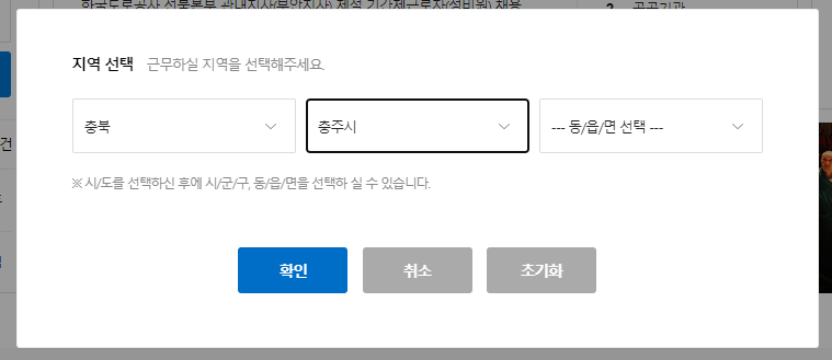 ② 지역검색에서 충북 > 충주를 선택합니다.
