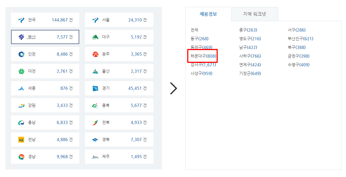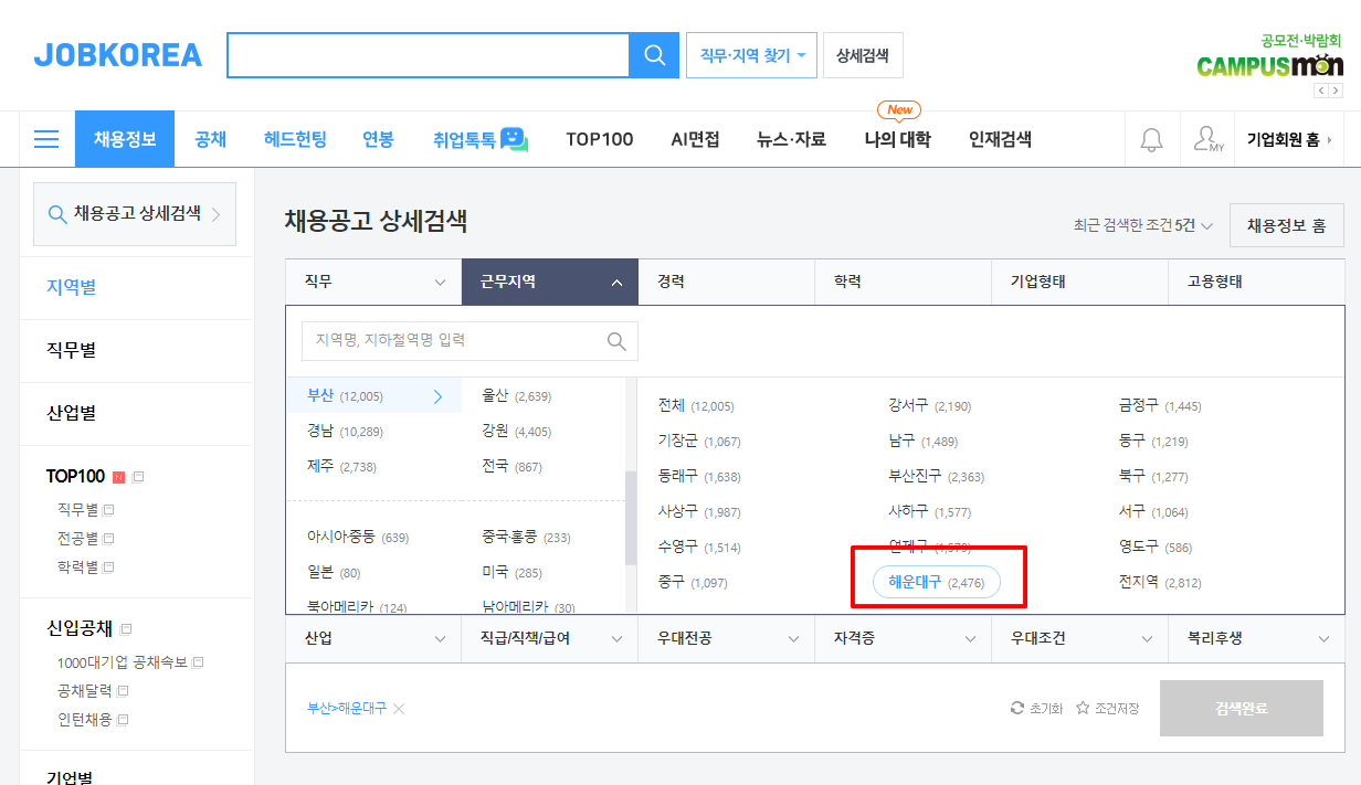 ② 채용정보를 누르시고, 지역별 세부메뉴로 들어가서 부산 > 해운대구를 선택하세요.