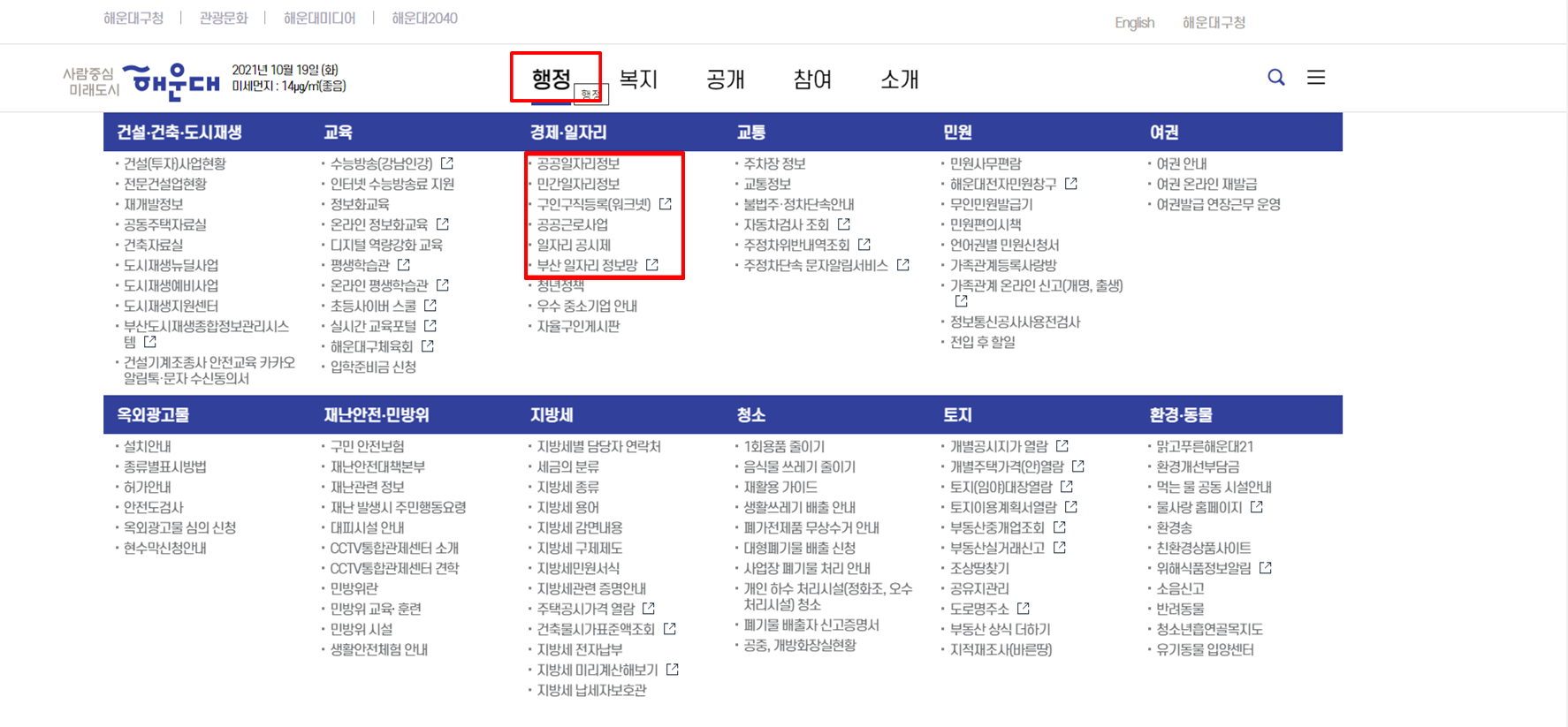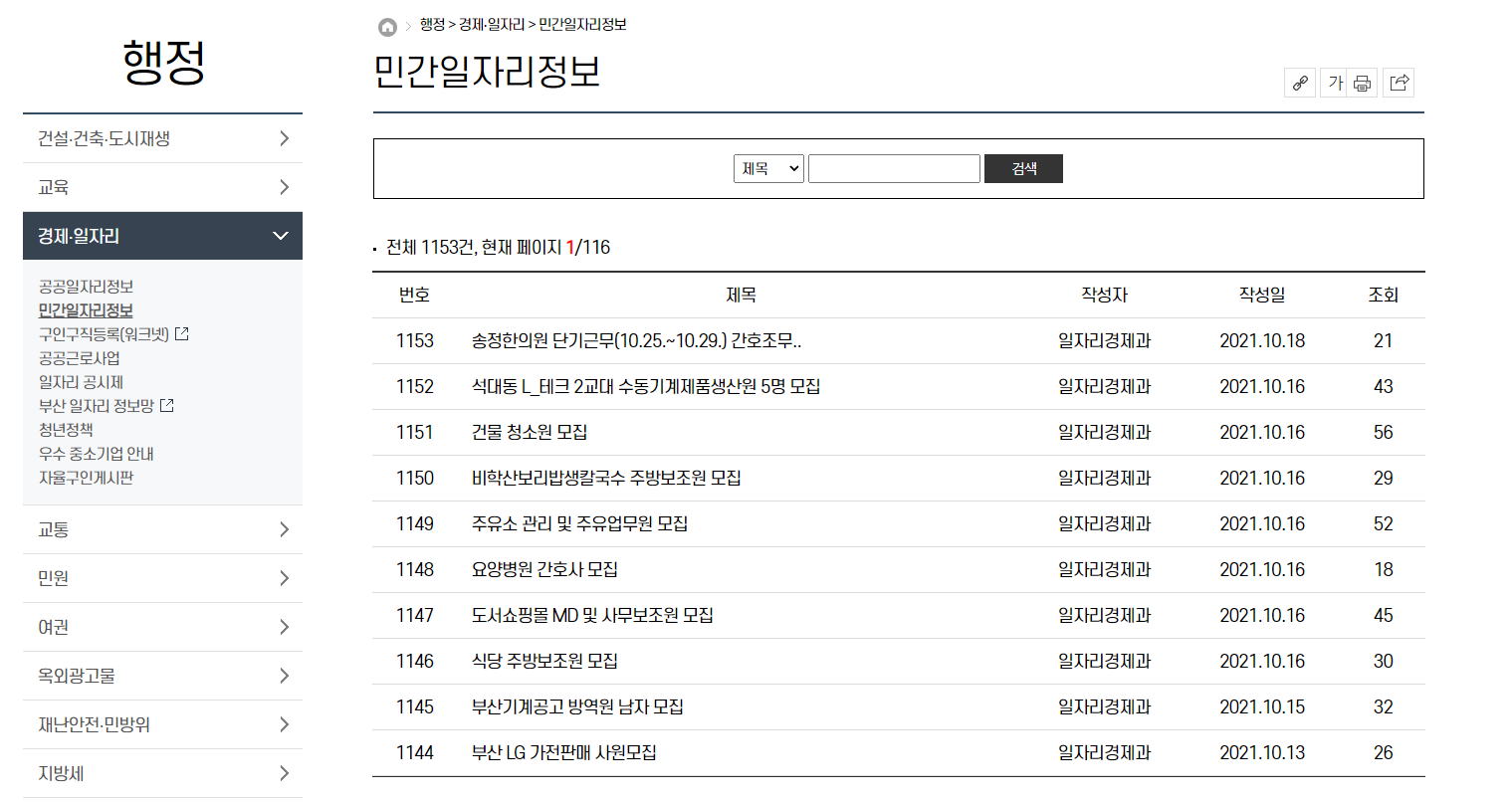 ② 상단메뉴에 행정부분을 누르시면, '경제, 일자리'부문에 민간일자리 정보, 구인구직등록 부분을 선택하세요.