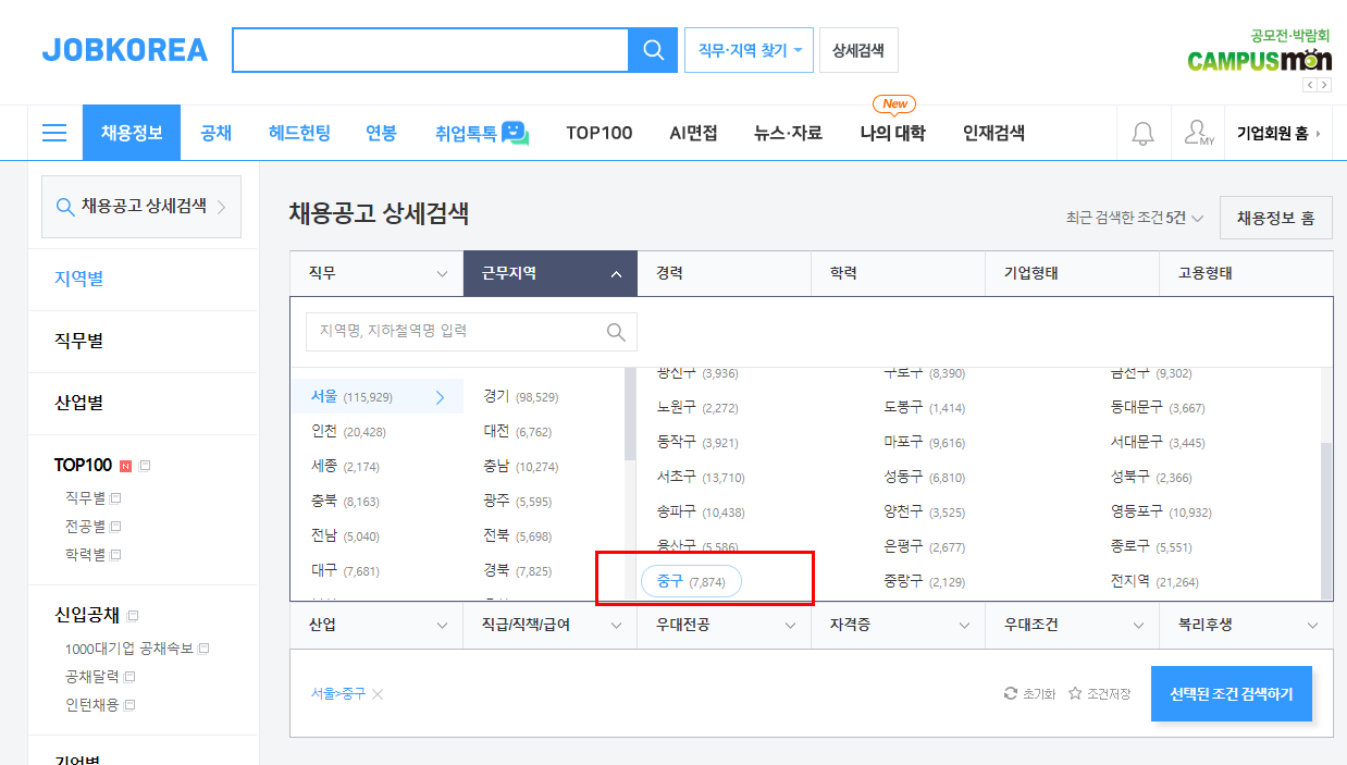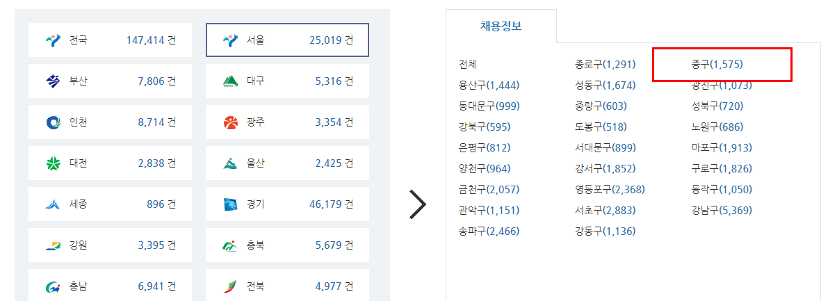 ② 채용정보를 누르시고, 지역별 세부메뉴로 들어가서 서울 > 중구를 선택하세요.