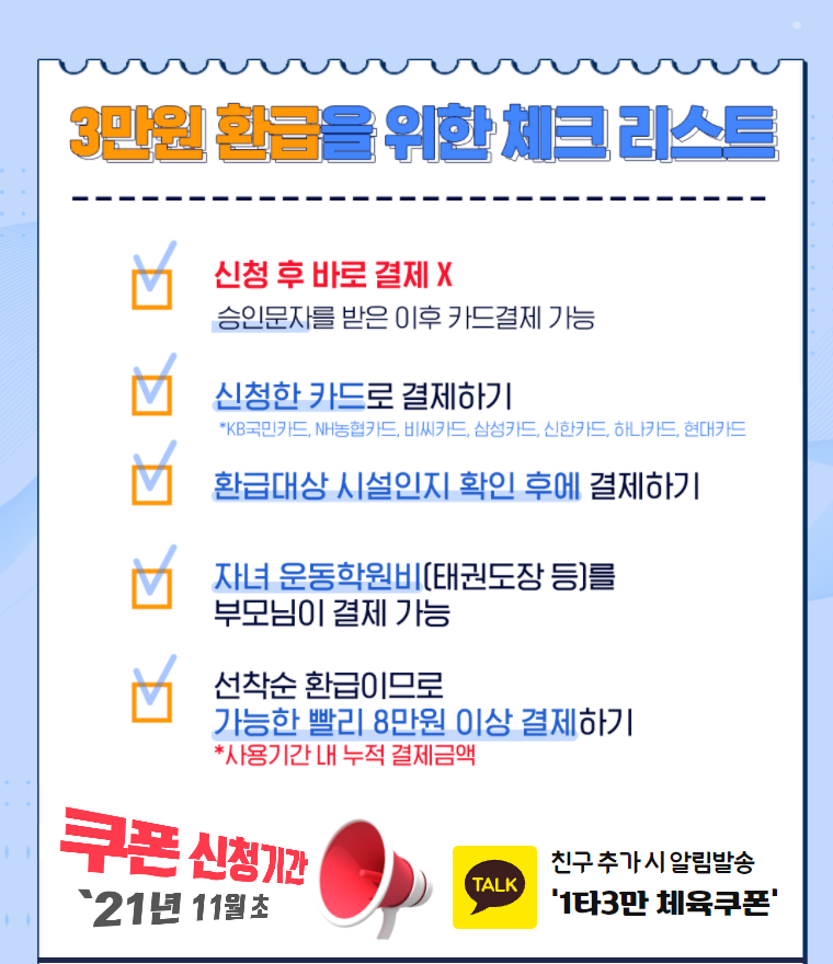 - 체육부문 : 실내체육시설 3만원 환급 (월 누적 8만원 이상시), 1타 3만 홈페이지 참고