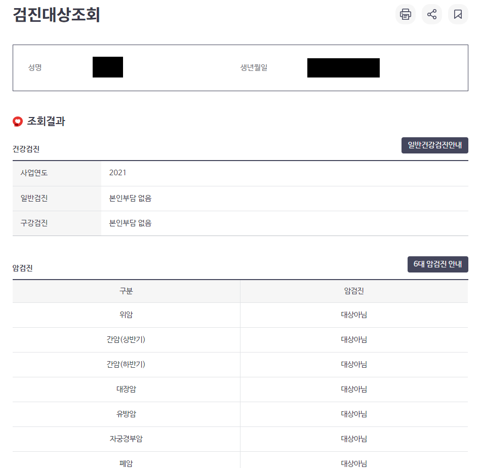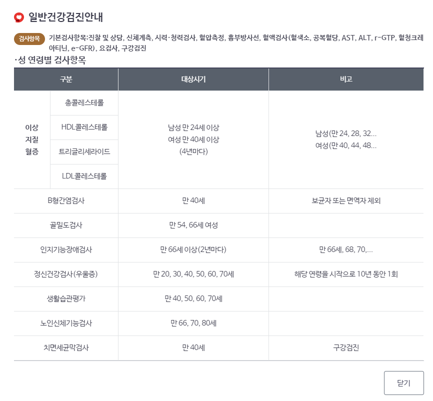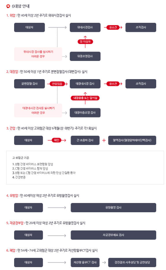 1. 위암 : 만 40세 이상 2년 주기로 위내시경 검사 실시 2. 대장암 : 만 50세 이상 1년 주기로 분변잠혈검사(대변검사) 실시 3. 간암 : 만 40세 이상 고위험군 대상 6개월 주기로 각 1회 실시 4. 유방암 : 만 40세 이상 여성 2년 주기로 유방촬영검사 실시 5. 자궁경부암 : 만 20세 이상 여성 2년 주기로 유방촬영검사 실시 6. 폐암 : 만 54~74세 고위험군 대상 2년 주기로 저선량흉부CT검사 실시