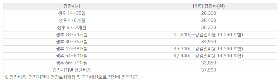 영유아 건강검진비용은 얼마를 부담해야 합니까? - 검진시기별 평균비용: 37,900원 (2021년 수가 기준) 영유아 건강검진은 어떤 제도인지? ○ 생후 14일∼71개월 기간에 월령별로 총 8회(3차례의 구강검진 별도)에 걸쳐 본인부담 비용 없이 건강검진을 받을 수 있으며,