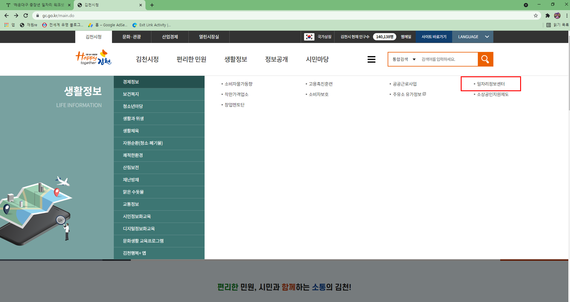 ② 상단메뉴에 생활정보를 누르시면, '일자리 정보센터'란이 있습니다.