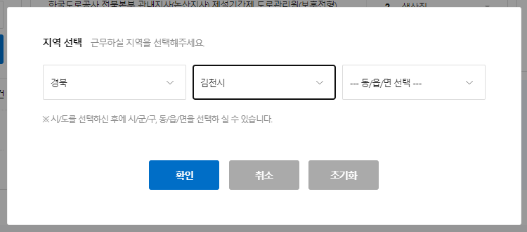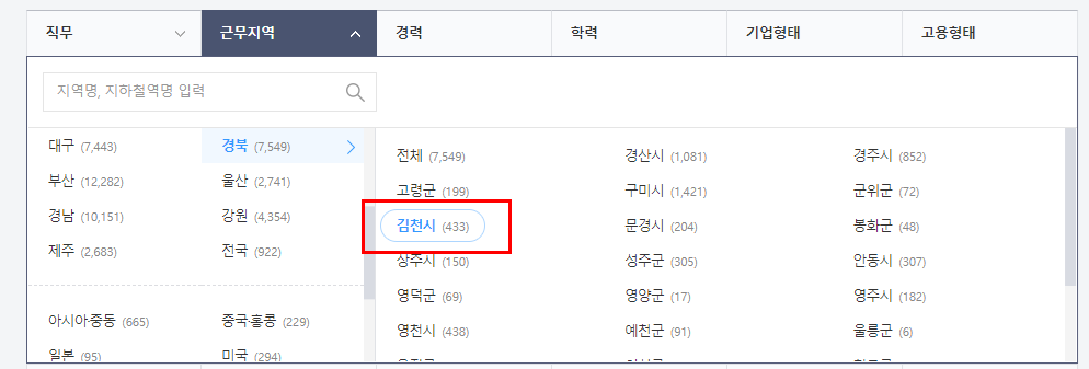 ② 지역검색에서 경북 > 김천시를 선택합니다.