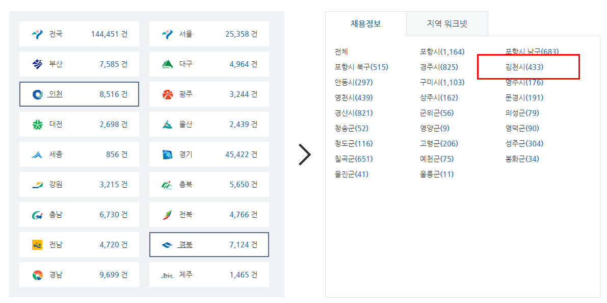 김천시의 일자리는 워크넷과 연계되어 운영됩니다. 지역워크넷을 통해서 김천시의 일자리에 대해서 알아보겠습니다.
