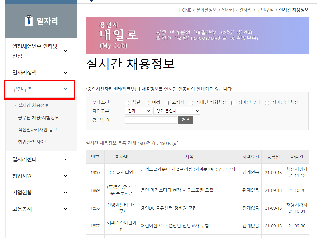 용인시 일자리 채용정보는 고용노동부가 운영하는 워크넷 정보와 연동되고 있습니다.