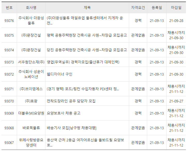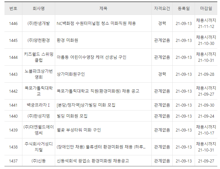 지역을 불문하고 나이와 직무중심으로 채용하는 민간기업의 채용정보를 알기 위해서는 잡코리아, 알바몬, 사람인, 원티드, 인디드, 메디컬잡, 시설잡, 드리이버스등의 잡포털 사이트를 통해서 정보를 얻을 수 있습니다.