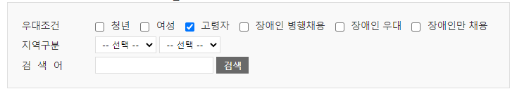 우대조건에 고령자라고 씌여진 부분에 체크를 하고 검색을 합니다. 고령자라고 체크를 했지만, 실제 채용하는 구인정보를 세부적으로 살펴보면 중장년부터 채용하는 것이 대부분입니다. 고령자를 우대하기 보다는 고령도 지원이 가능하다는 뜻으로 이해하시면 됩니다.