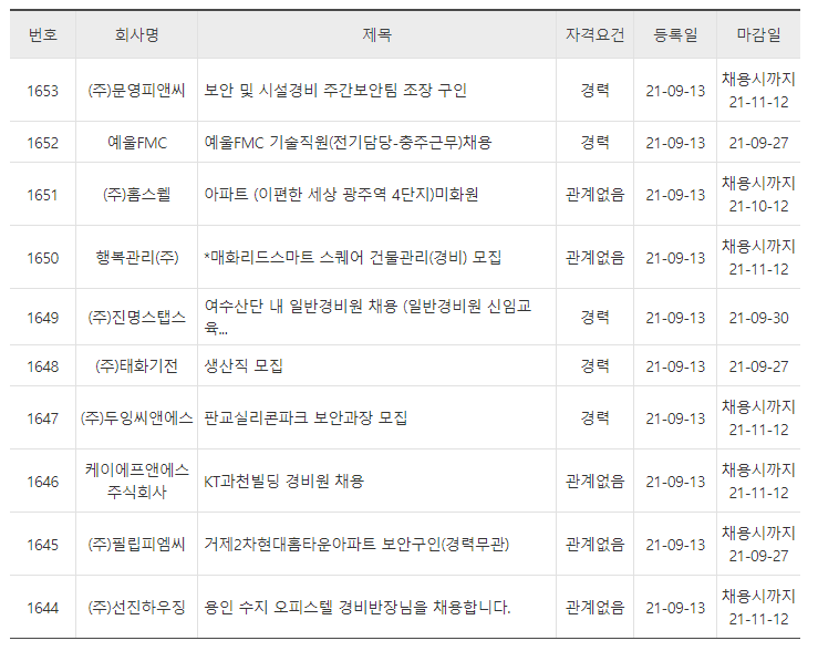 그러한 직무는 경비지도사 및 경력, 선임배치교육을 수료한 부분을 채용하는 것으로서 대부분 2개월 이내에 긴급한 채용을 하는 경우가 많습니다. 이유는 경비를 채용하는 경우 경비지도사가 선임되어야 하고, 배치신고를 해야 하는 경비업법 행정신고 부분이 있기 때문입니다. 참고바랍니다.