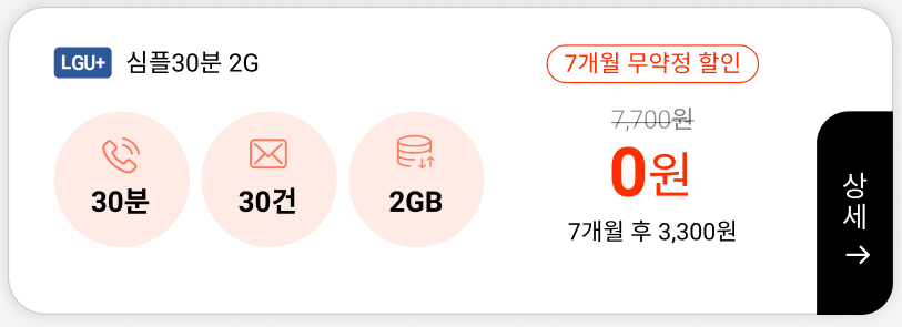 - LGU9+ l 심플 30분 2G ㅣ 통화 30분, 문자 30건, 데이터 2GB