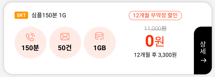 - SKT망 ㅣ 심플 150분 1G l 통화 150분, 문자 50건, 데이터 1GB