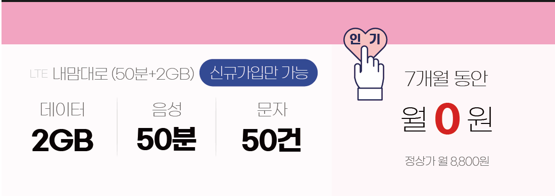 - LGU+ 내맘대로 ㅣ 통화 50분, 문자 50건, 데이터 2GB (단, 신규가입만 가능합니다. 번호이동은 혜택없습니다)