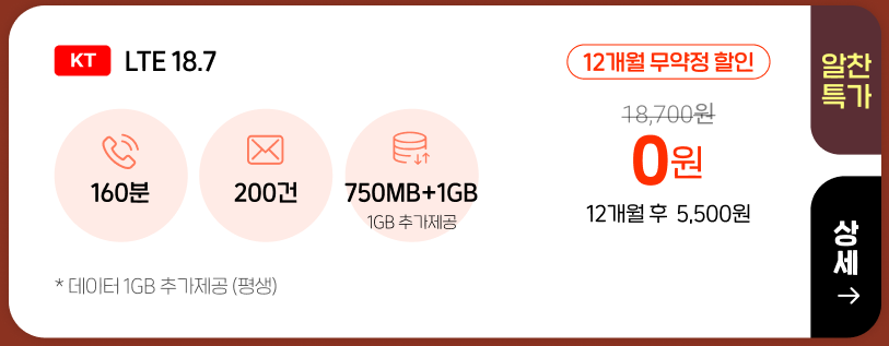- KT 망 ㅣ LTE 18.7 : 통화 160분, 문자 200건, 약 2GB정도 데이터 제공