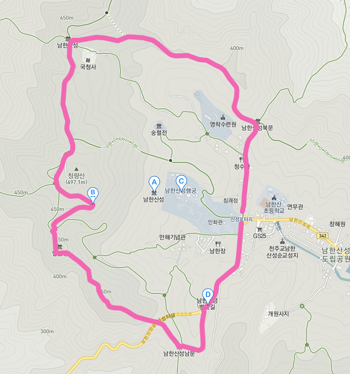 산성역에서 출발하여 남한산성의 주변을 크게 돌아 남한산성 입구삼거리로 돌아오는 코스입니다.