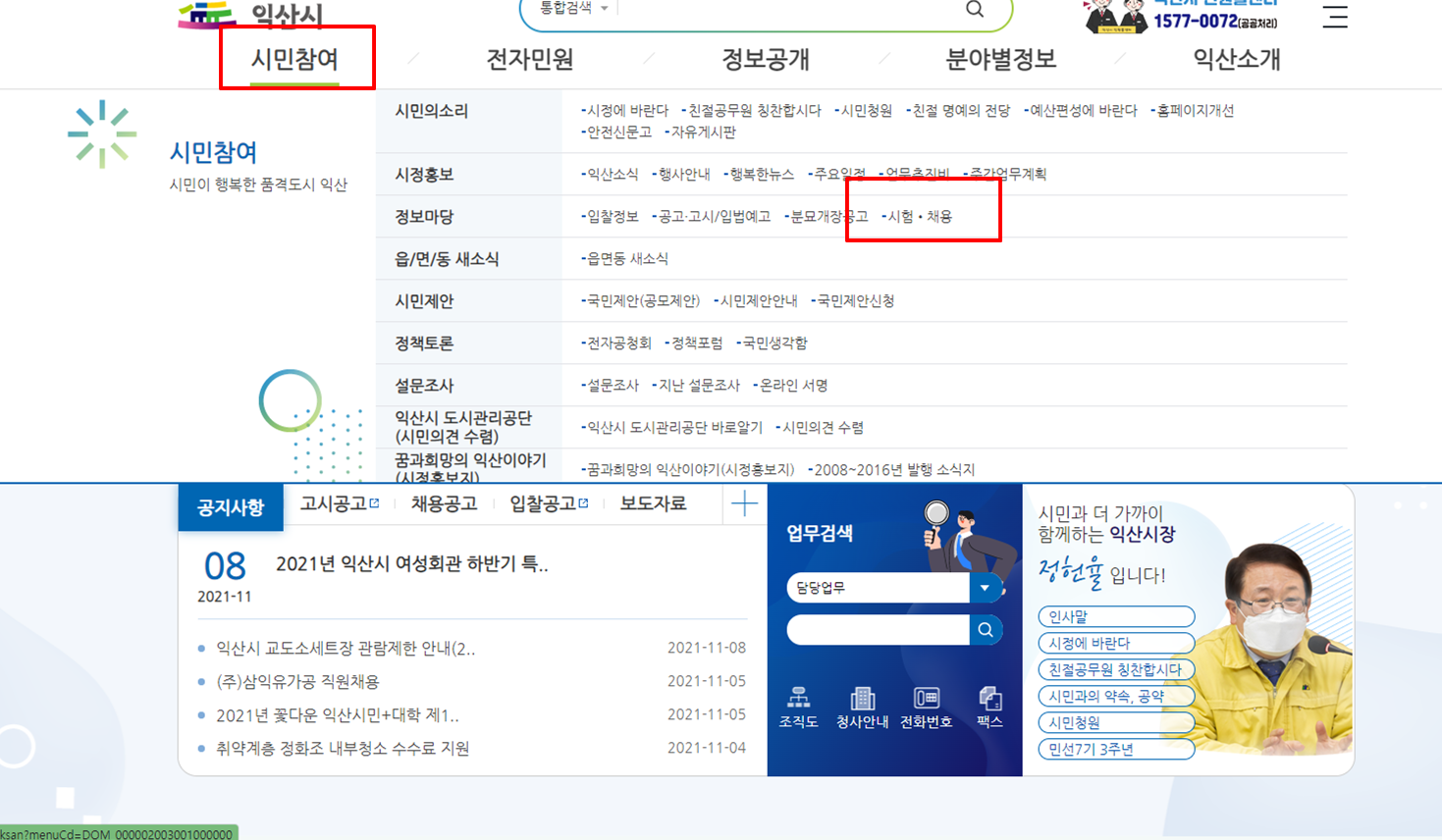 ② 상단메뉴에 '시민참여'난을 누르시고, 정보마당 '시험,채용'을 선택하세요.