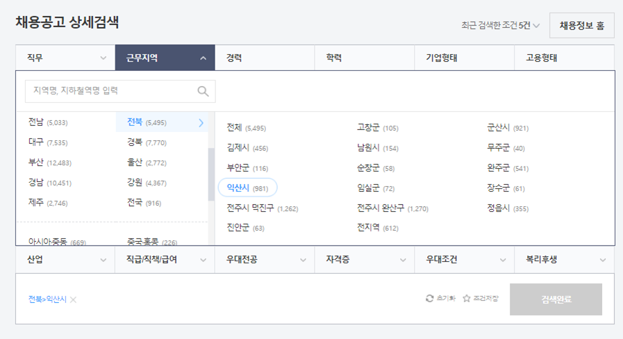 ② 채용정보를 누르시고, 지역별 세부메뉴로 들어가서 전북 > 익산시를 선택하세요.