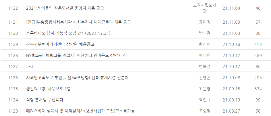 업종별로 구분되어 있지 않습니다. 작은 도서관 기간제 채용부터~식당 홀서빙까지 다양한 일자리가 게재되어 있습니다. 참고하시기 바랍니다.